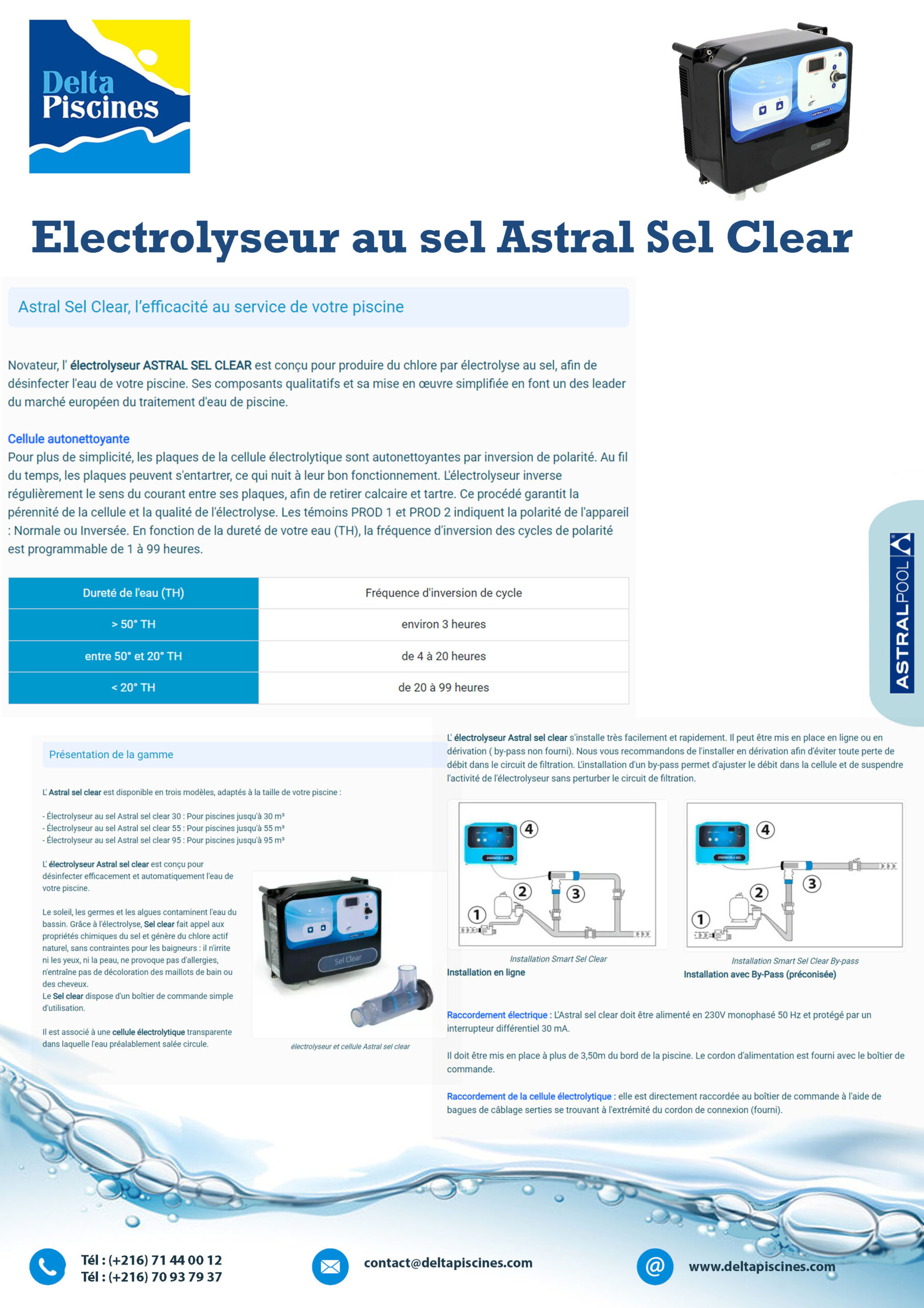 – Électrolyseur au sel Astral sel clear 95 : Pour piscines jusqu’à 95 m³